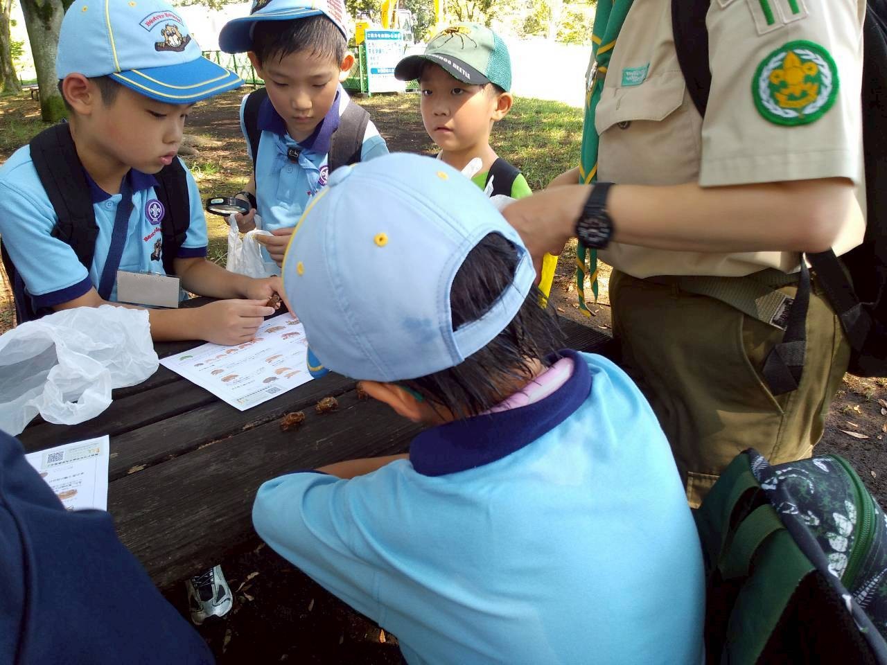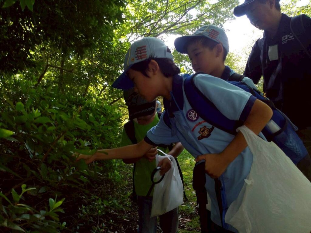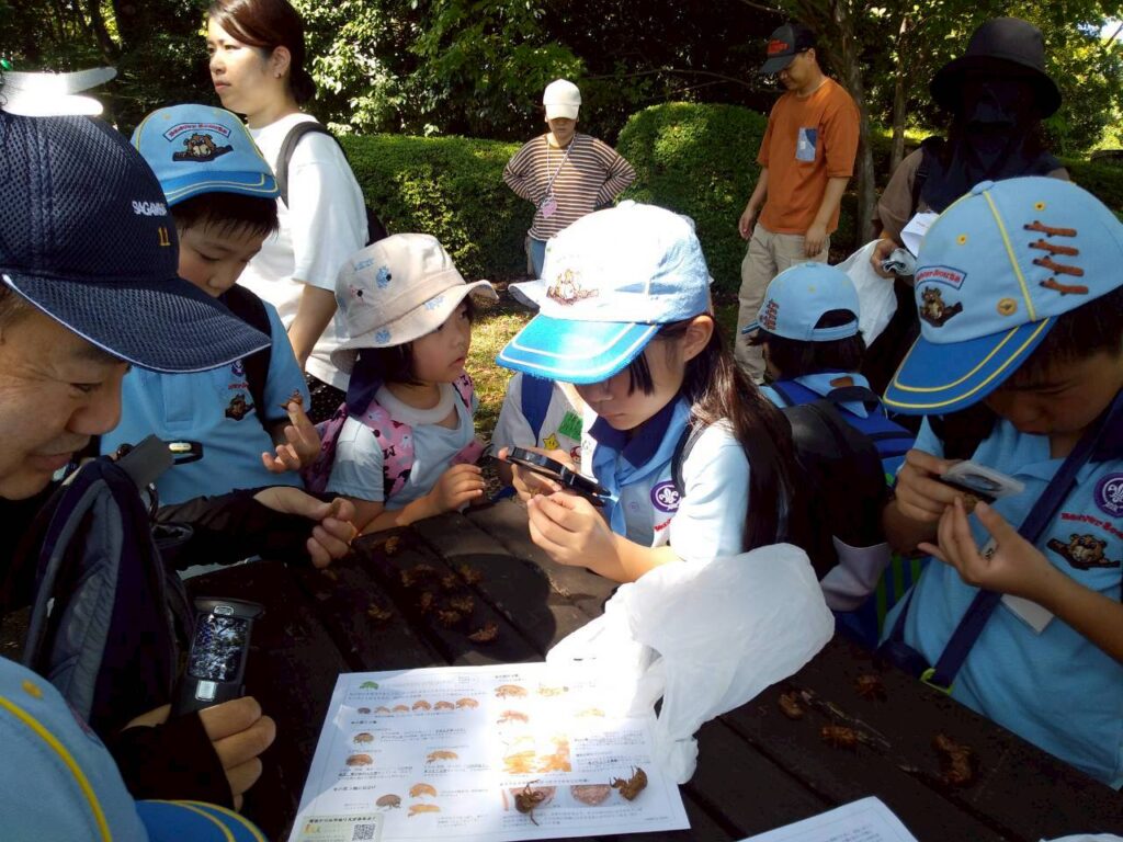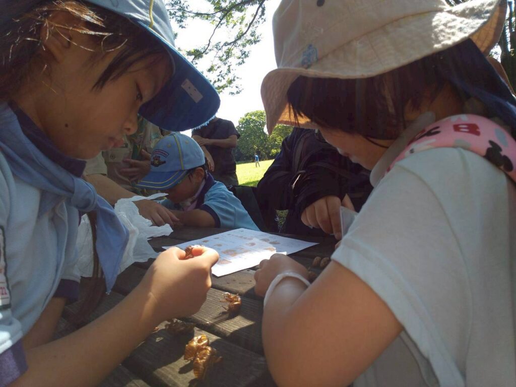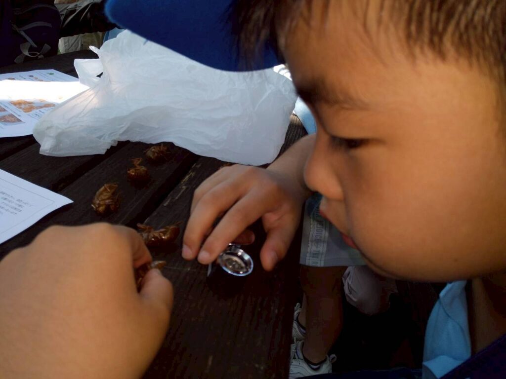 今回は麻溝公園で植物や生物を観察しながら、蝉の抜け殻を集めて観察しました。